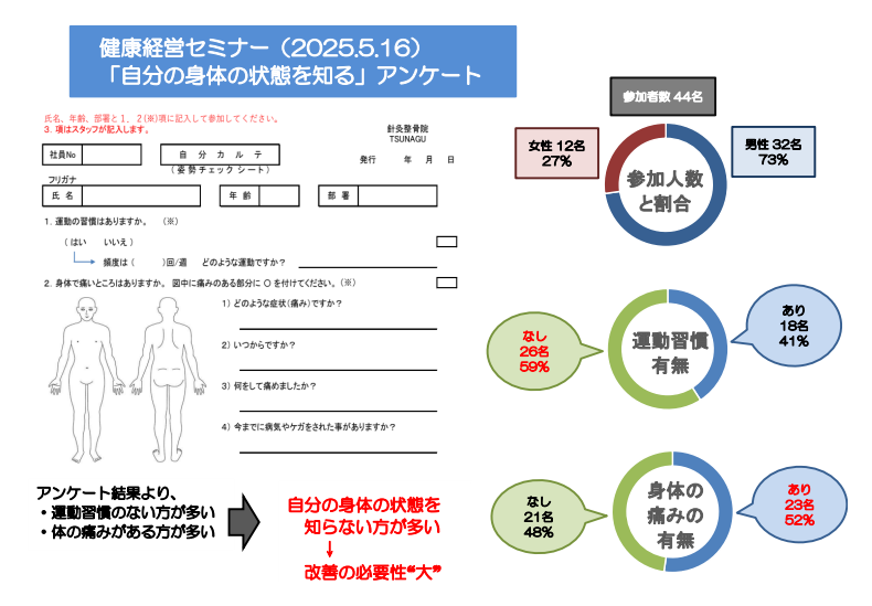 5/16㈮、経営報告会「健康経営イベント」において、「ベジチェック」で野菜摂取レベルを測定。昼食は「健康志向昼食」として知多半島のトマトを使用した”ヘルシーピザ”と健康経営アドバイザー厳選の健康ランチ”食物繊維豊富なおにぎり&野菜飲料&低カロリースープ他”を提供。ピザはキッチンカーを手配して”熱々”を提供しました。また、健康経営セミナーでは鍼灸整骨院TSUNAGU様による「自分の身体の状態を知る」をテーマに講演していただきました。今回のイベントでは、コミュニケーションの促進と食生活の改善(野菜を摂取しよう)、運動機会の増進(自分の身体の状態を知ろう)を目的に交流することが出来ました😃