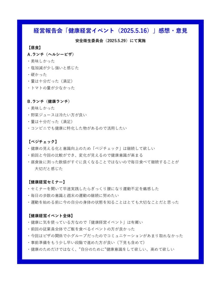 また、5/29㈭の安全衛生委員会では「健康経営イベント」の感想や意見交換等も行い、次回の健康経営イベントに向けて反省や改善等の話し合いが出来ました。
