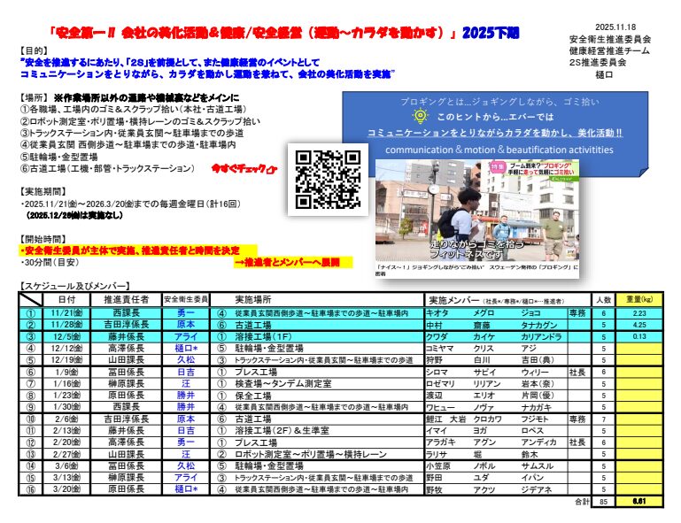 3回目の活動は、本社工場で活動を行いました。担当グループは溶組グループです。溶接工場1階をメインに実施し、ごみ拾い、掃き掃除をしました☺今回の活動よりお水と飲料ゼリーから「ヤクルトY1000」の配布に変更。ストレスをやわらげる機能や睡眠の質を高める機能、腸内環境を改善する機能があることが報告されていることから従業員の身体とこころの健康づくりサポートとして導入しました🤩