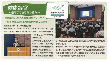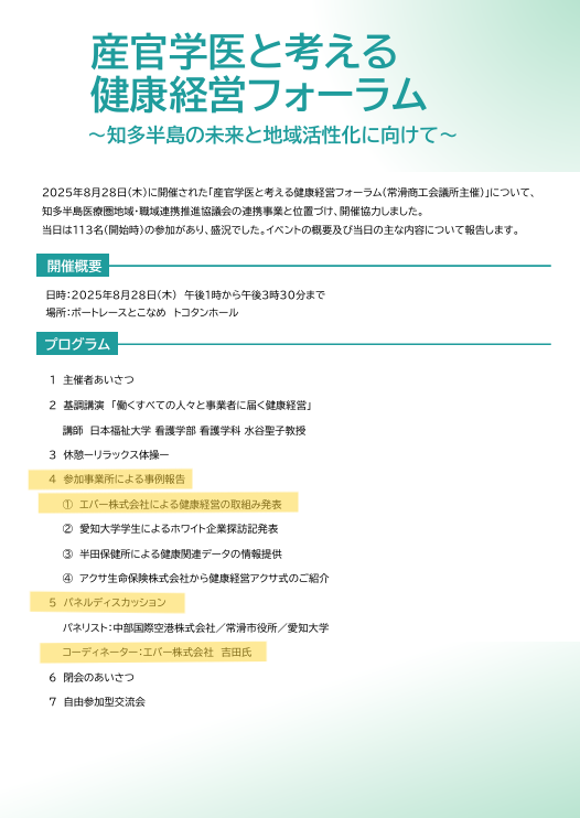 半田保健所様のホームページに8月28日に行われました「産官学医と考える健康経営フォーラム」の開催報告がアップされ、弊社が発表させていただきました取組事例や司会進行をさせていただきましたパネルディスカッションの内容が掲載されております。