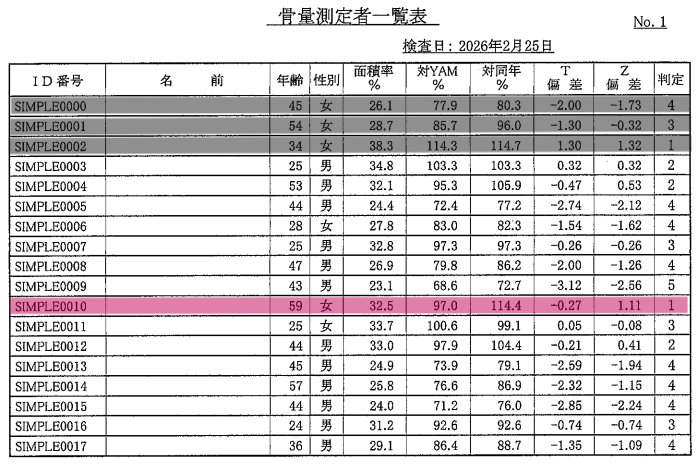 ★判定…「1:良好」骨量十分、「2:平均域高め」骨量平均域、「3:平均域低め」骨量平均域低め、「4:低め」骨量やや少なめ、「5:要注意」骨量かなり少ない(骨折注意!)