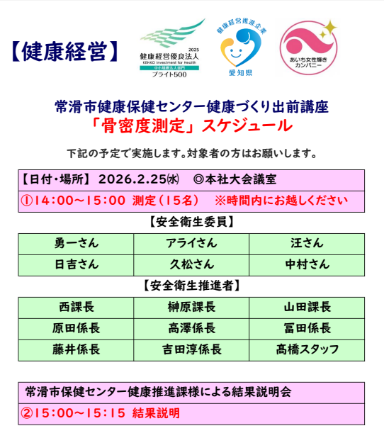 2026年2月25日㈬、常滑市保健センター 健康づくり出前講座を活用して「骨密度測定」を実施しました。今回の出前講座は企業での”初”実施という事で弊社が1番となりました☺実施対象者は安全衛生委員及び安全衛生推進者と総務課スタッフで行いました。また、59歳女性の方が「1:良好」骨量十分で素晴らしい結果でした‼そして、意外にも意外…皆さんが骨密度測定に興味があったということでした‼新たな発見がありました💡