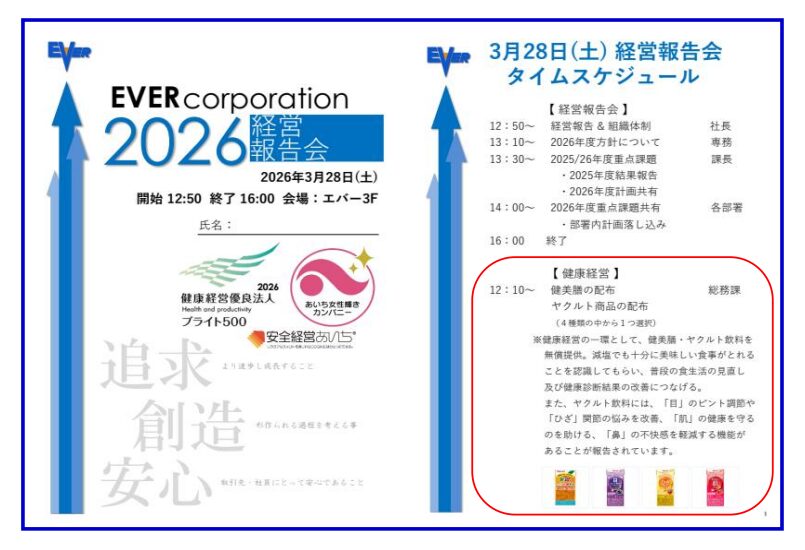 3/28㈯、経営報告会「健康経営イベント」において、昼食に健康メニューとして「健美膳」を提供。減塩でも十分に美味しい食事が摂れることを認識してもらい、普段の食生活の見直し及び健康診断結果の改善につなげます。また、ヤクルト飲料には「目」のピント調節や「膝」関節の悩みを改善、「肌」の健康を守るのを助ける、「鼻」の不快感を軽減する機能があることが報告されていることから、従業員の生産性低下防止のため、筋骨格系の症状の予防や花粉症、眼精疲労等の取り組みとして提供しました。イベント当日に従業員のご家族が経営している「フルーツとまと」の配布もありました😘嬉しかったです♡